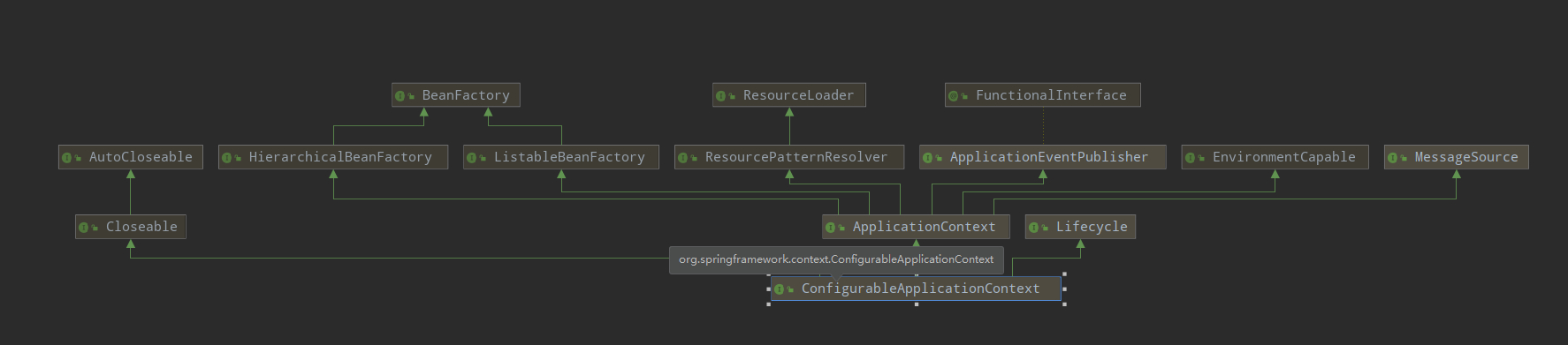 方法会先显式的获取应用上下文对象,如果对象为空,再加载默认的环境配置,通过是否是webEnvironment进行判断,默认选择的是AnnotationConfigApplicationContext(注解上下文,通过扫秒注解来加载bean),然后通过BeanUtils来实例化应用上下文对象然后返回,ConfigurableApplicationContext类继承关系如下: