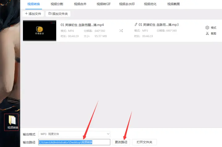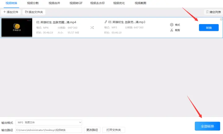 5、点击全部转换按钮把添加好的mp4视频格式转换成mp3音频格式。转换好后找到预设好的输出路径就可以打开mp3音频了。
