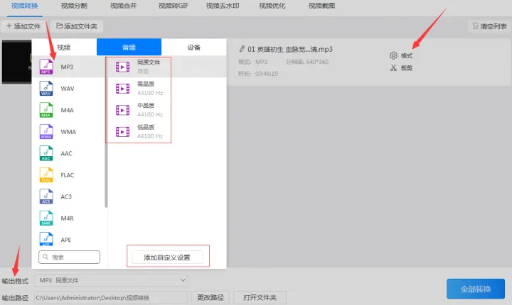 4、点击格式或输出格式按钮设置把输出的格式设置为音频格式下的mp3格式,如果需要调整其他参数也可以根据需求设置。