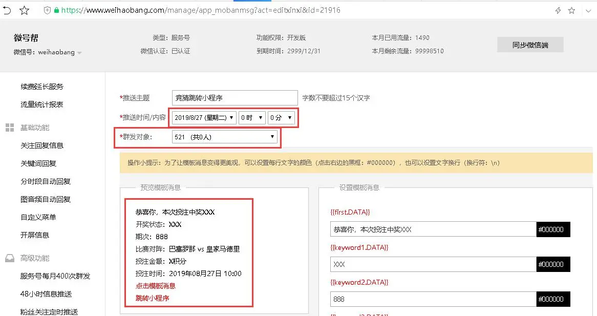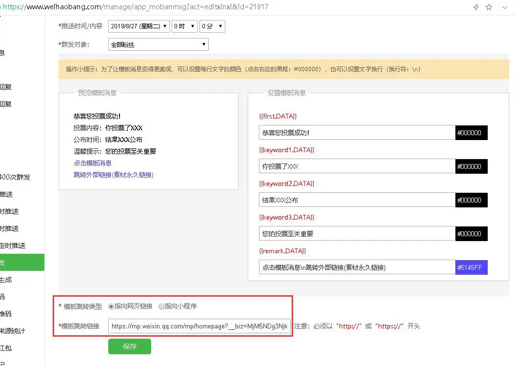 微号帮平台模板消息群发,支持跳转,粉丝点击后访问网页或进入小程序。