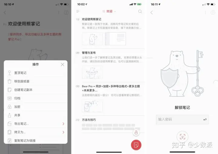 在 v1.7 中,我们可以对单篇笔记进行加密锁定设置,该功能支持 iOS、iPadOS 和 macOS,也支持面容 ID 和指纹 ID。需要注意的是,笔记锁定功能需要订阅 Bear Pro 才可以使用。