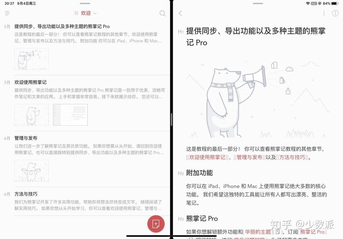 在即将发布的 iPadOS 的中,一个实用功能是「多空间使用」,我们可以将同一个 App 在多个空间窗口中打开。现在熊掌记已经支持了 iPadOS 多空间使用,在主屏幕打开熊掌记后,我们可以呼出 Dock 栏,利用「分屏浏览」就能再打开一个熊掌记窗口,相关功能将在 iPadOS 正式发布后再上线。