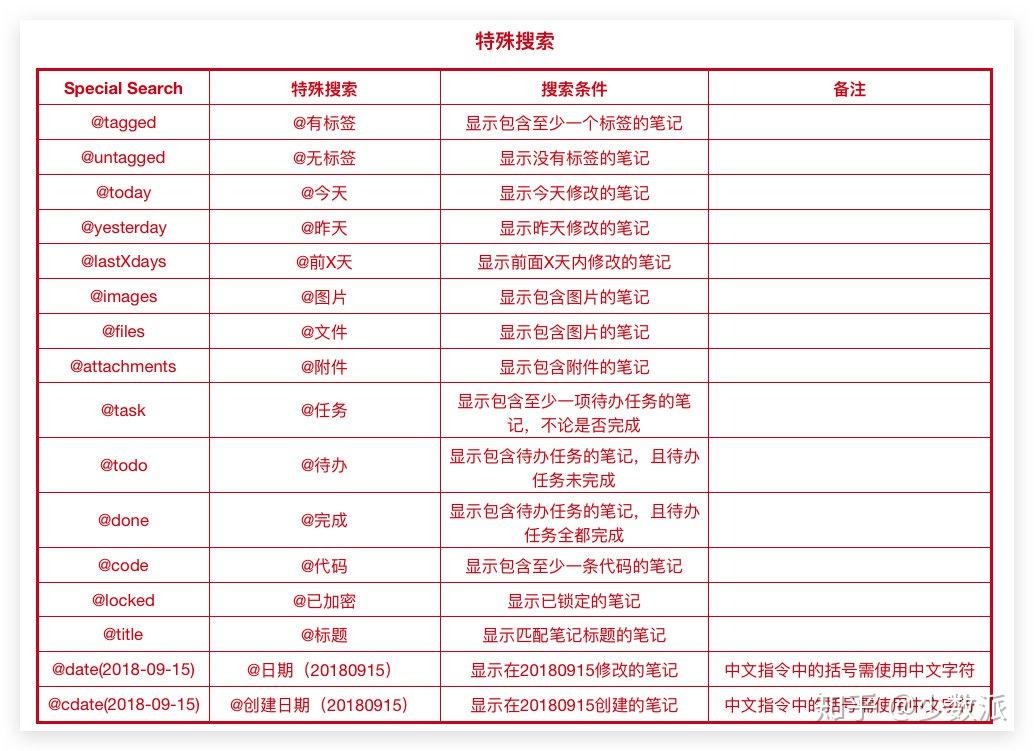 特殊搜索支持中文了,这也是熊掌记的一个高阶用法。在笔记列表的搜索框中,我们可以利用 @有标签、@日期(20180915) 等指令来搜索符合特定条件的笔记。需要注意的是,部分指令中的符号需使用中文字符。
