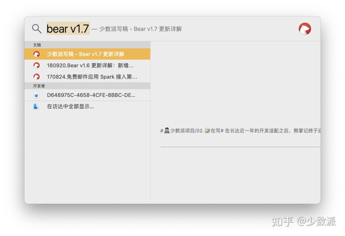 在应用外部,macOS 版熊掌记支持聚焦搜索(Spotlight)了。现在我们可以利用聚焦功能随时搜索到熊掌记的笔记。在 iOS 和 iPadOS 上,聚焦搜索显示熊掌记笔记的结果更加迅速。在应用内部,如果检索文本出现在笔记标题中时,这条笔记在搜索结果中还会优先显示。