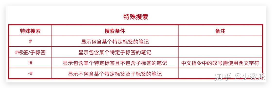 特殊搜索新增了三条关于搜索标签的指令,用于搜索含特定标签的笔记,甚至是标签的子标签:#、!#、-#。需要注意的是,利用特殊搜索搜索标签时,必须打全标签,如果我们想要进行标签的模糊搜索,那么在搜索框中直接输入标签即可,不需要用#。