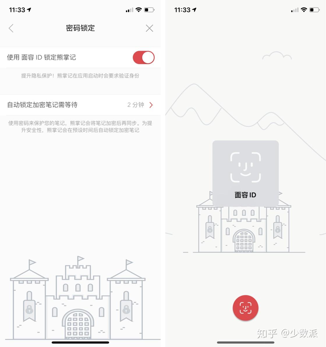 在 iOS 和 iPadOS 版熊掌记中,进入应用的 设置 - 密码锁定 中开启,那么每次熊掌记进入后台后重新打开,都需要使用面容 ID 或指纹 ID 验证身份后才能打开应用。注意,在 iOS 上该功能不支持使用密码锁定。在 macOS 版中则是进入 偏好设置 - 通用 中开启。