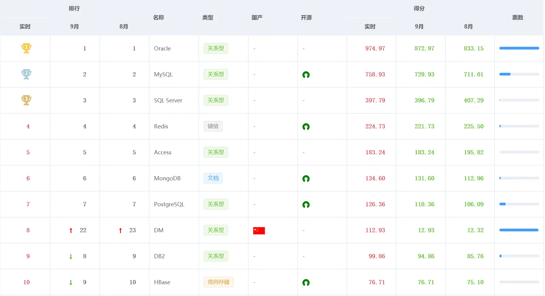 9月数据库排行出炉 墨天轮 2019-09-06 148 阅读1分钟 本月,墨天轮发布了最新的数据库实时排行榜,并添加了投票功能。在此排行榜中不仅有Oracle、MySQL、SQL Server等国外的知名数据库,也包含了DM、GaussDB、TiDB等国产数据库。排行榜根据搜索引擎、趋势指数、博文数目、招聘岗位数、书籍数目、文献数目、问答数目、db-engines等数据来计算出数据库当月的得分和热度。所以,在排行榜中你可以看到国产数据库排行、可以很直观的看到哪个国产数据库最好。马上登陆墨天轮,给你支持的数据库投票吧。