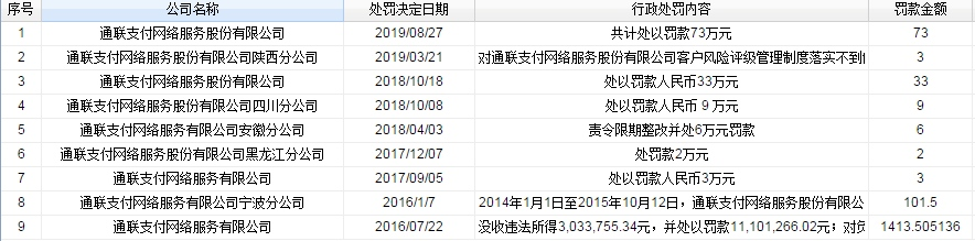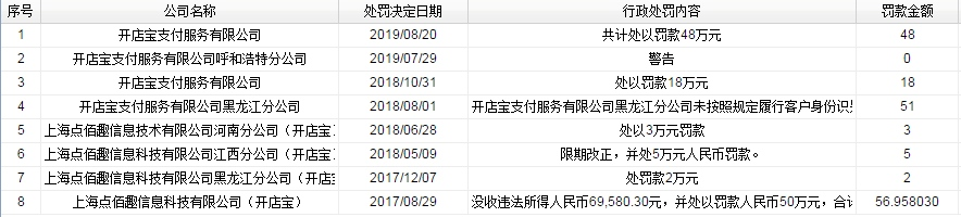 三家支付机构再被央行处罚 BCPAY 2019-09-06 188 阅读1分钟 近日中国人民银行上海分行再次对三家支付机构作出行政处罚。因违反支付业务规定,开店宝、通联支付、东方付通分别处罚48万、73万元、4万元。其中,前两家支付机构均是多次违规多次被罚。 相关数据显示显示,开店宝已有8次公开处罚记录,累计处罚金额近200万元。其中通联支付则要更多一些,被央行公开处罚达9次之多,累计处罚金额超过1000万元。
