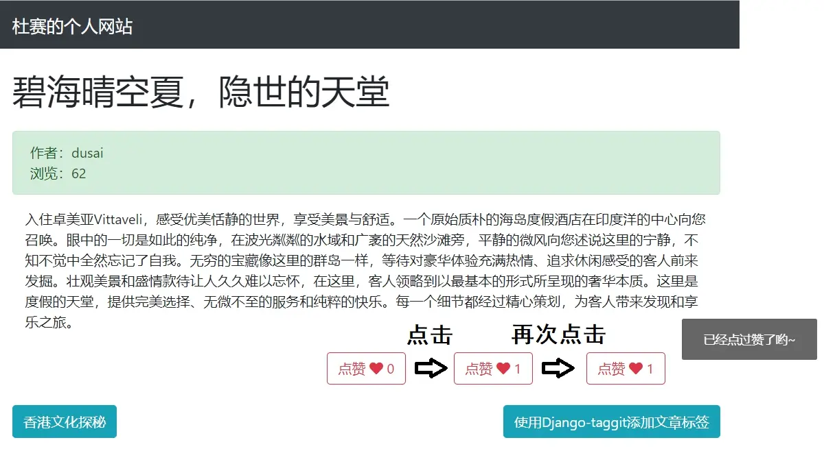 上面的 HTML 代码功能很简单,提供一个点赞的按钮,点击此按钮时会触发叫做validate_is_like的 JavaScript 函数。特别需要注意的是 '{% url 'article:increase_likes' article.id %}' 都是用的单引号,这里千万不能用双引号,原因请读者思考一下。