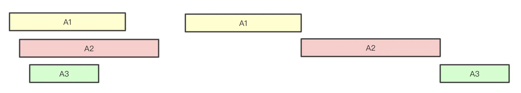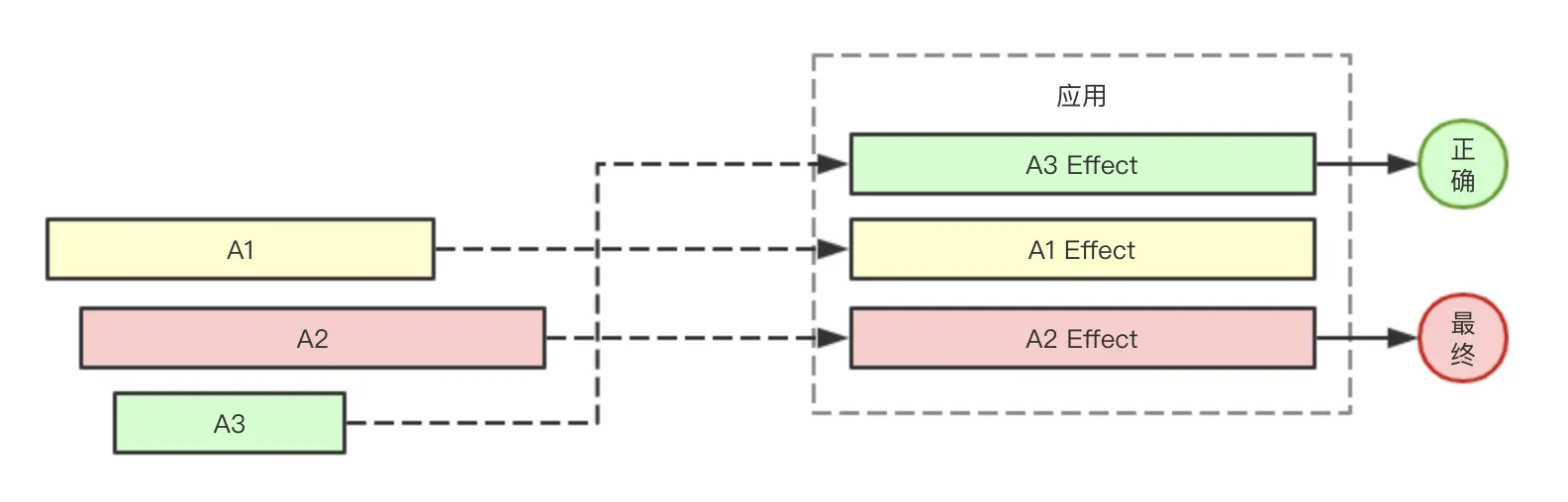 假设我们有三个异步请求:A1 -> A2 -> A3,按时间触发,每一个请求经过服务器后,再响应返回,会对应用产生一些副作用 (Effect)。