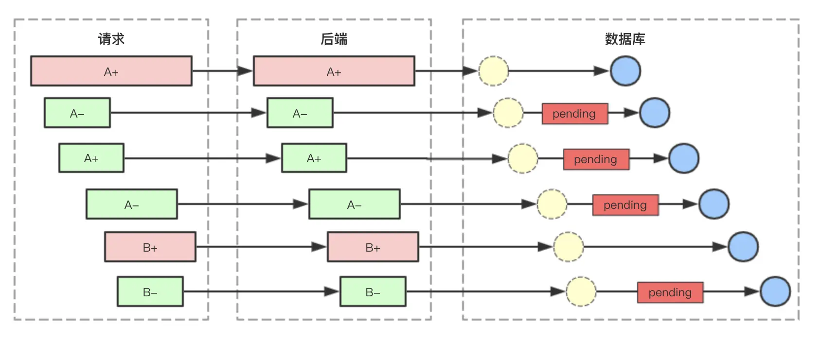 如下图,我们假设服务器数据库 A、B 分别代表用户的两种权限,A+请求会增加数据库 A 值,A-操作会减少数据库 A 值,B 操作同 A,而服务权限不可能为负值,如下图: