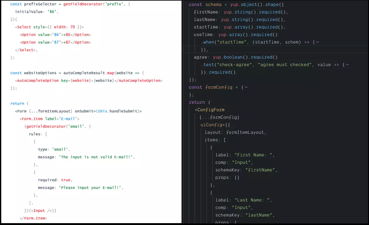 左边的图是基于ANTD正常的写法,我们要写Form,要写检验规则,要写子组件等等,关键是这些逻辑是糅合在一起的。右边是基于config-component提供的ConfigForm组件做了封装,只需要提供JSON schema配置数据即可驱动你的页面,分离数据校验和UI逻辑,UI逻辑基于UIconfig,数据校验基于schema做校验。
