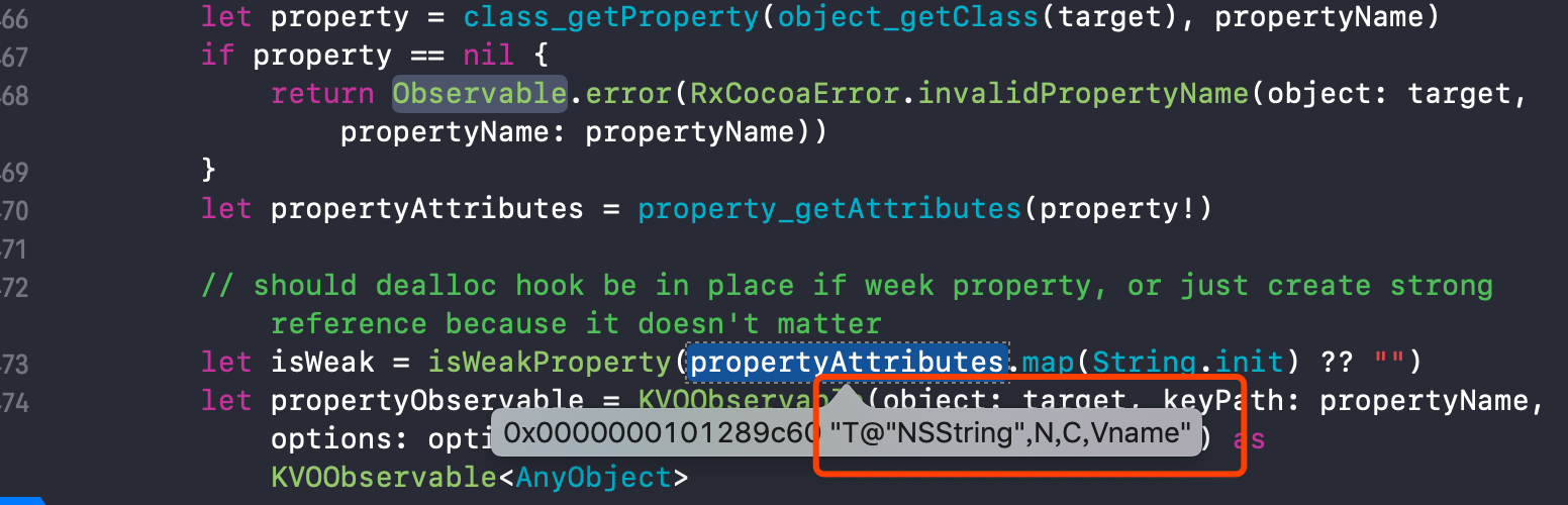 _RXKVOObserver,发现它竟然是一个OC类,说明了RxSwift的KVO底层实现利用了OC实现的 - 这里保存了