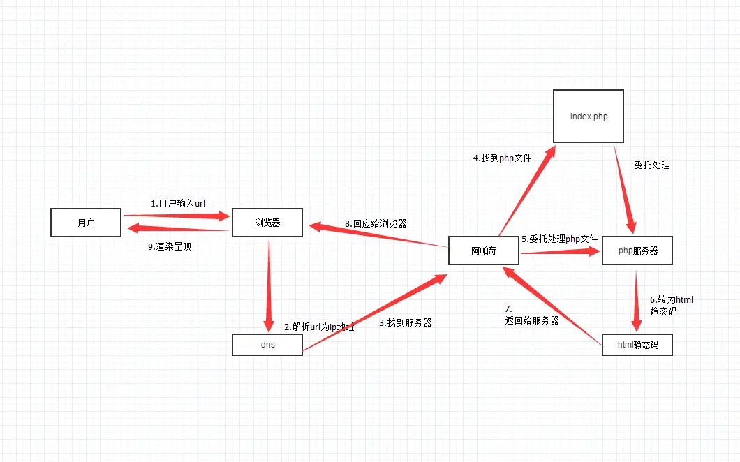 - 与上面相同,经过dns解析后的ip找到服务器,服务器找到相应的php文件;