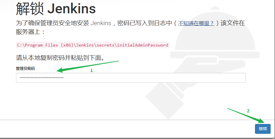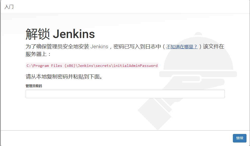 我们可以从 ${jenkins}\secrets\initialAdminPassword 文件中,找到解锁密码。把它拷贝到解锁页面中的管理员密码输入框,然后点击“继续”按钮: