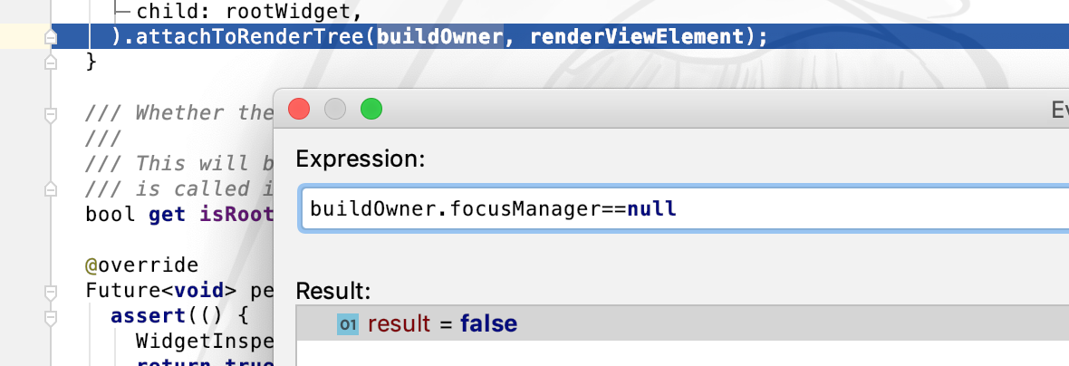 这里通过RenderObjectToWidgetAdapter对象的attachToRenderTree方法为_renderViewElement进行赋值。这里小蓝下一步会走到哪?由于renderView是一个get方法,所以也是可执行单元,其中的三个入参的获取要早于RenderObjectToWidgetAdapter构造。 所以会先执行renderView方法。