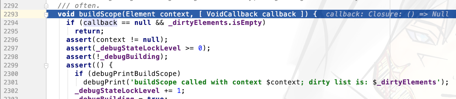 这里提问:小蓝在此时会走到哪?我好像听到有人说是先执行第二个入参里的方法,因为它可执行。答案是进入buildScope,因为第二参只是一个函数类型的入参,并没有被触发。于是到达了buildScope,这个Flutter框架核心环节之一: