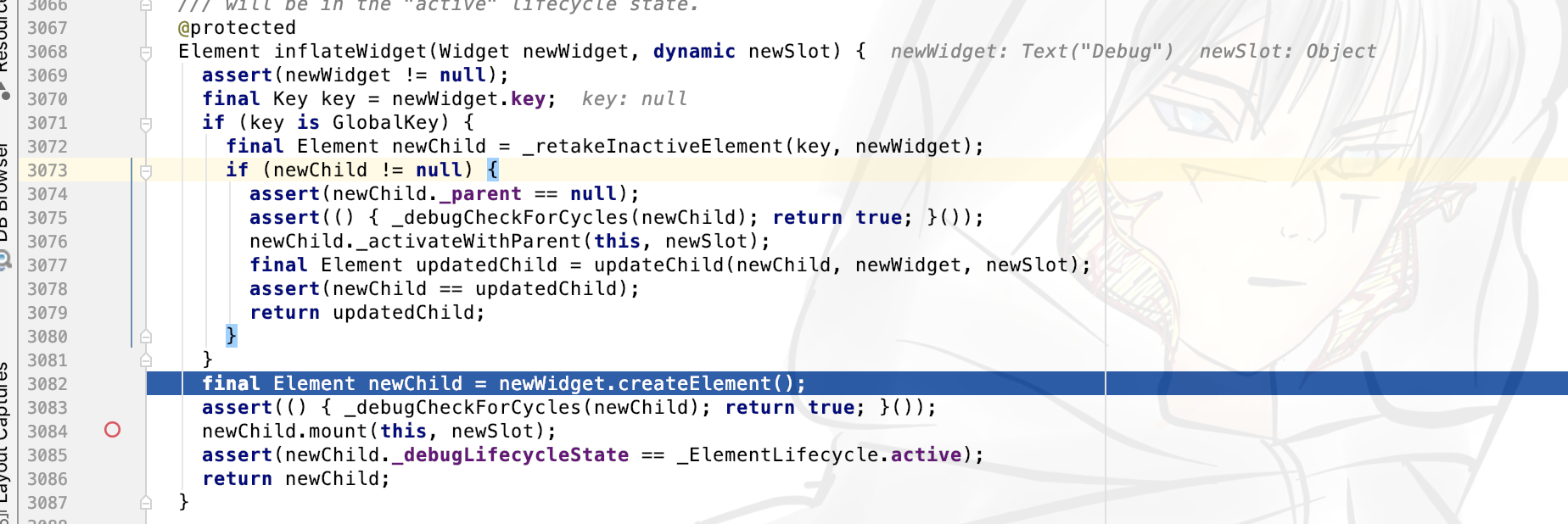 比如在inflateWidget这里再打个断点,运行时,首先会停留在第一个断点mian那里