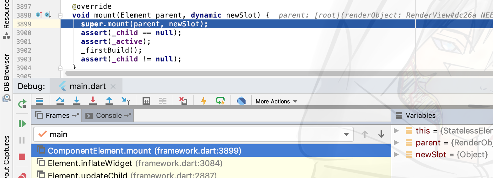 这时候会到达attachToRenderTree,这里提一下,下面的Frames里可以看到当前执行处所在的位置,让你不至于连在哪都不知道。