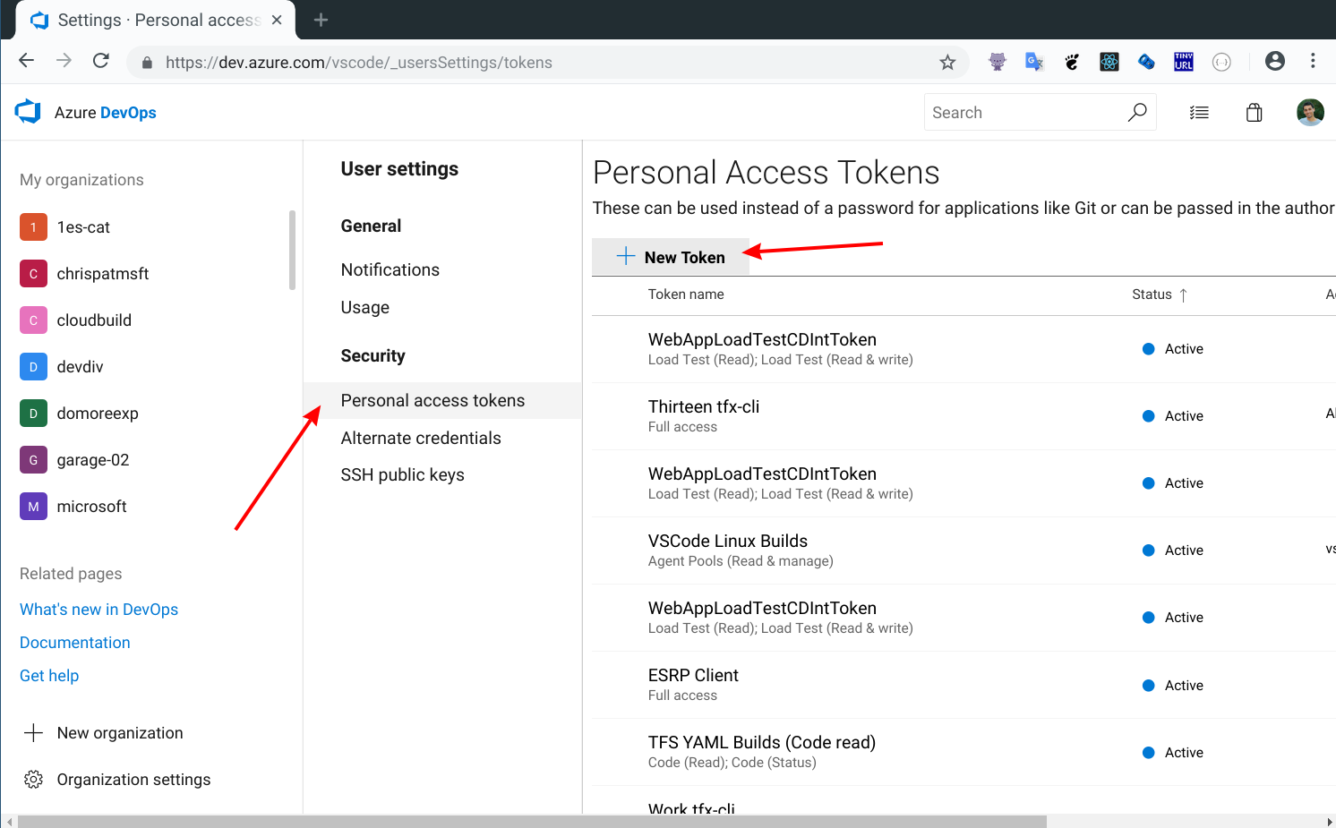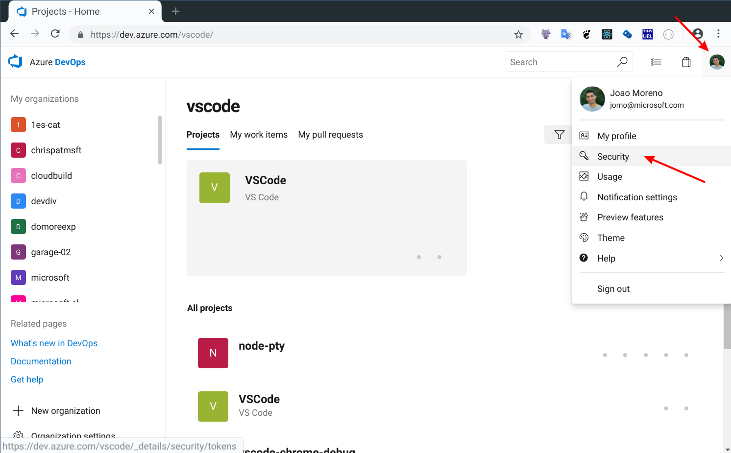从您组织的主页(例如:) dev.azure.com/vscode,转到“ 安全性”页面: