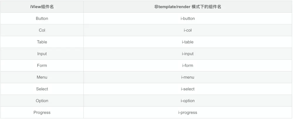 有一些特别组件在使用 CDN 引用时,即非template/render 模式下,需要加前缀i-,且组件名小写,相关组件如下所示: