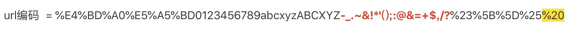 可通过第二章的4.2小节了解到,-_.~&!*'();:@&=+$,/?#[]%(最后一个是空格)这些特殊字符可能存在于网址请求的路径或参数表中,若不进行转义编码,容易在URL解析时,引起歧义,造成解析错误,找不到指定的资源,造成网络请求失败或错误。此方式只能用于处理URL编码规定字符集之外的字符且不含有以上特殊字符的编码处理。