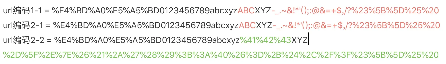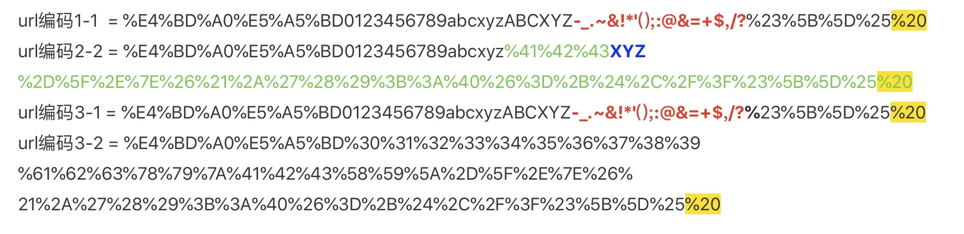 注意:最后一个是空格符号,编码2-2强制编译了自定义字符集 ABC-_~.!*'();:@&=+ $,/?%#[],对结果如下: