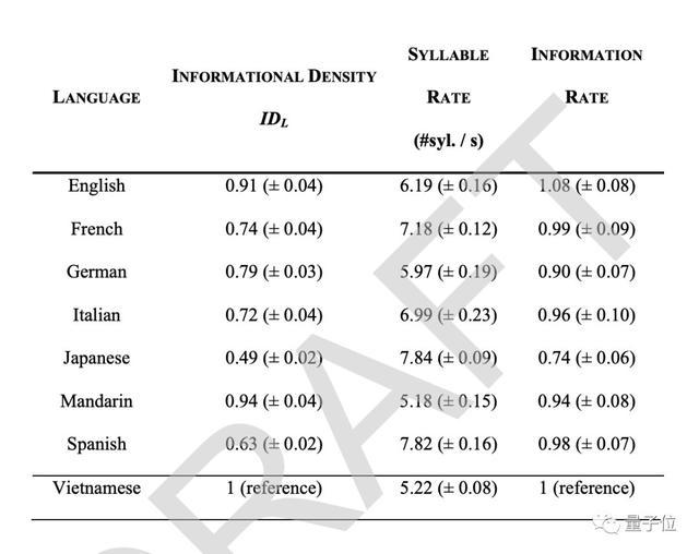 研究人员发现,日语只有643个音节,每个音节的信息密度约为5比特;英语的音节数量为6949,每个音节的密度为7比特;越南语最为复杂,平均每个音节包含8比特的信息,排在所有语言之首。