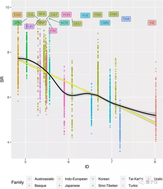 然后,他们对比了17种语言每个音节的信息密度(ID)和音节速率(SR)的关系,二者呈高度的负相关关系,相关系数达-0.89。