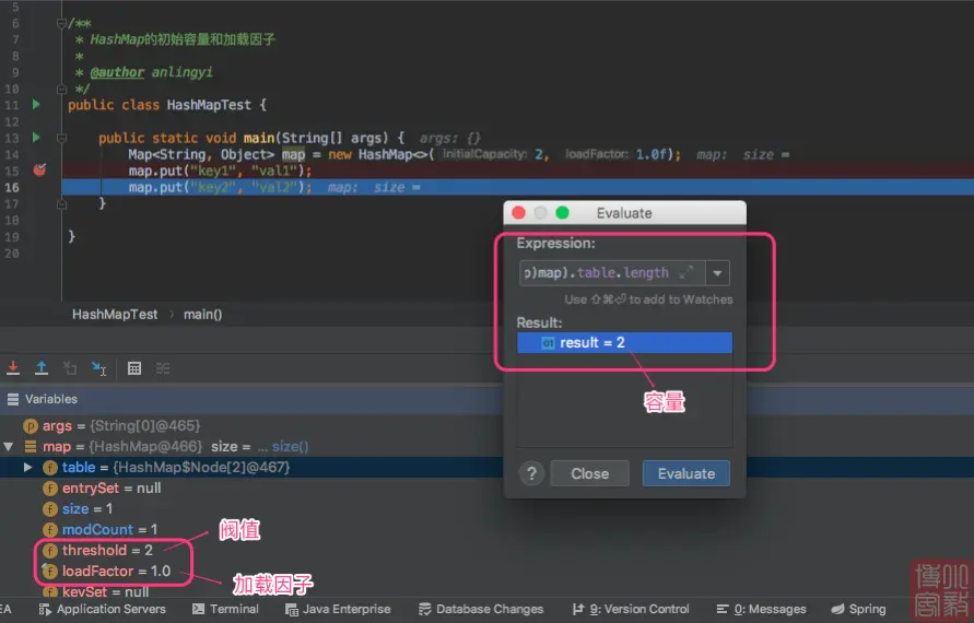 当添加完第1个值后,容量为2,加载因子为0.75,阀值为1