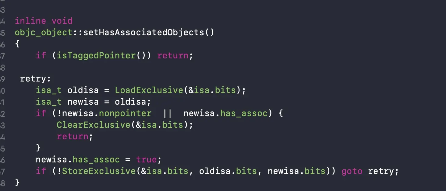 setHasAssociatedObjects,这里把属性和类关联起来,并且设置isa指针的标识isa.has_assoc,以便释放的时候使用 -