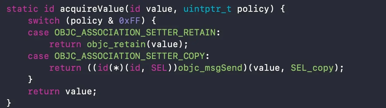 void objc_setAssociatedObject(id object, const void *key, id value, objc_AssociationPolicy policy) {