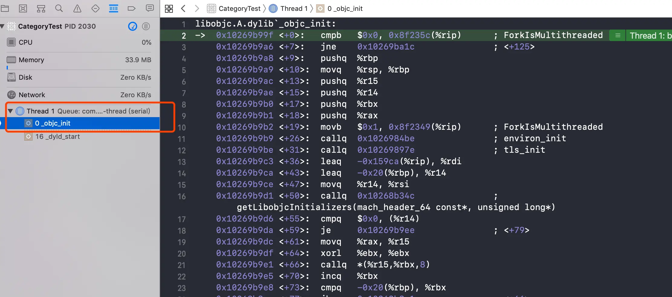 先验证一下_objc_init是否是入口函数,打开刚才的测试工程,添加一个符号断点_objc_init,然后运行工程