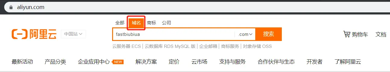 首先登录阿里云,。网页的话直接在搜索框输入自己想要的域名即可(不知道有没有和我一样,起名字要想半天...)