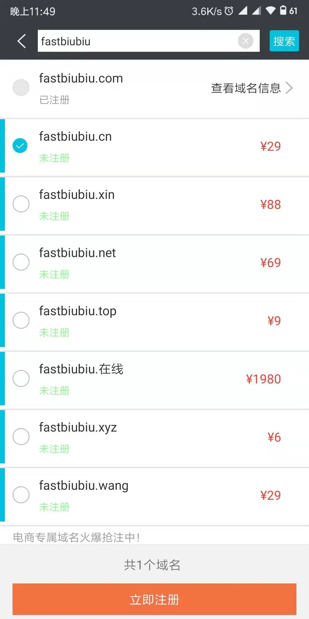 我这里是使用的手机app,在【控制台-域名服务-注册域名-搜索】即可