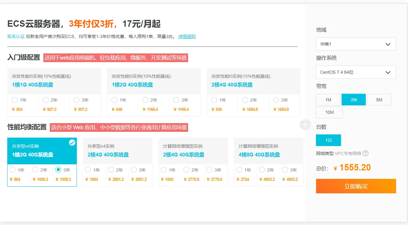 如果和我一样时一次购买阿里云服务器的话,推荐到这里购买,里面的优惠幅度很大(在校学生除外,只要9.9,羡慕),我购买的配置如下,做个人开发测试足够了。各位可以根据自己的需求选择。