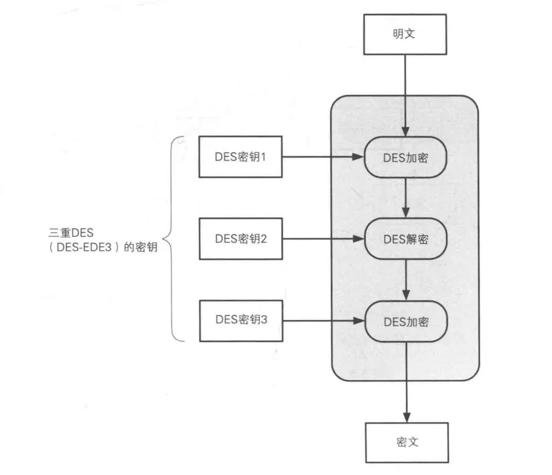 这种方式就是为了避免DES的缺点,既然DES加密一次会不安全,那就多加几个步骤,这里加密解密再加密三次就叫做三重DES。DES 密钥长度为 56 位,所以 3DES 密钥长度为 56 * 3 = 168 位。