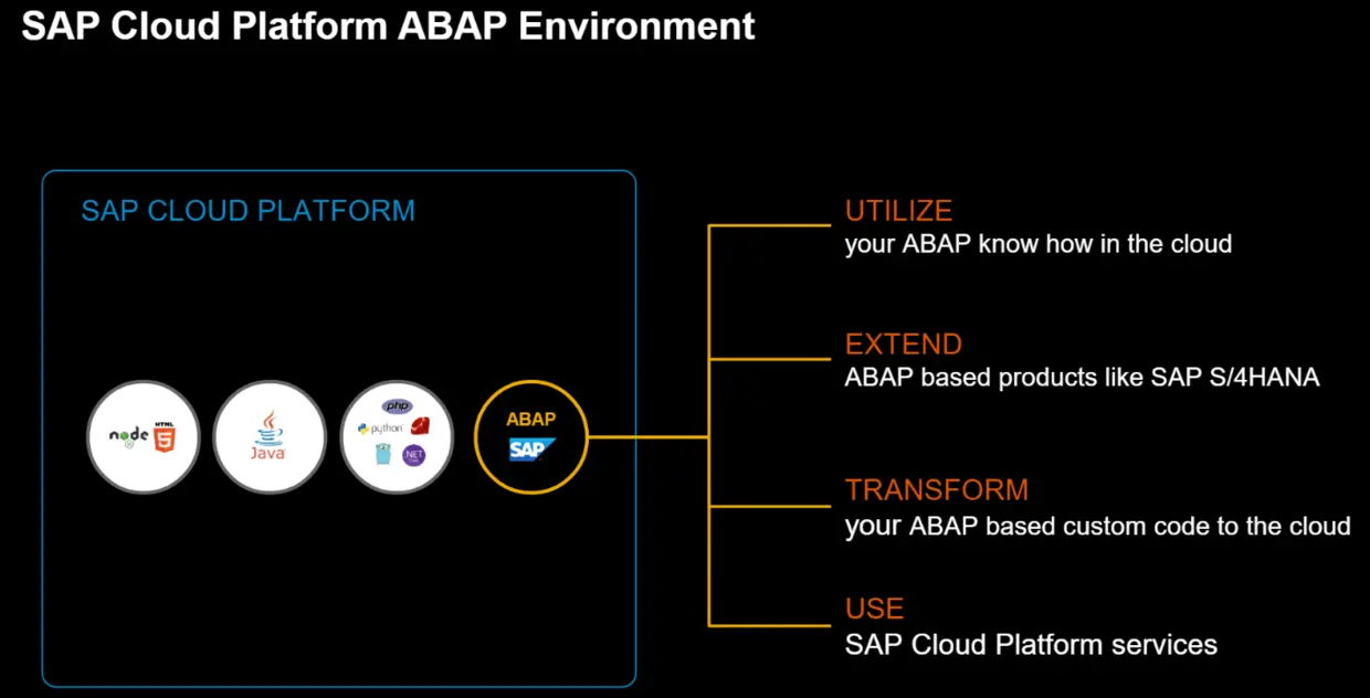 同样的,对于完全由ABAP语言编写的S/4HANA和Cloud版本来说,同样需要提供一个类似的平台,允许其客户和partners在其上方便地进行二次开发。最理想的情况,就是partners之前在On-Premises系统里积累的开发技能可以继续使用,同时在这个新的平台里,能够方便地使用SAP云平台上提供的各种基于云的功能强大的服务。