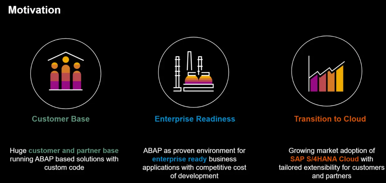 一方面,全球海量的客户的业务运行在基于ABAP的SAP解决方案之上,另一方面,随着当今业界云转型浪潮的深入进行,SAP也相应推出了越来越多的云解决方案,比如在数字化转型中扮演了数字核心角色的SAP S/4HANA,在云端的对应解决方案即S/4HANA Cloud.