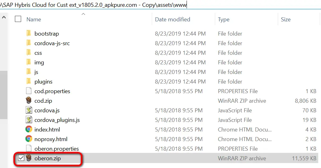 我的同事Yang Joey在他的文章SAP移动应用解决方案之一:HTML5应用 + Cordova = 平台相关的混合应用里也介绍过,如果把C4C Android平台应用的apk文件的扩展名改成zip然后解压之后,会发现它实际上是一个通过Cordova打包的web应用,其中就包括oberon.zip——C4C UI框架的实现。