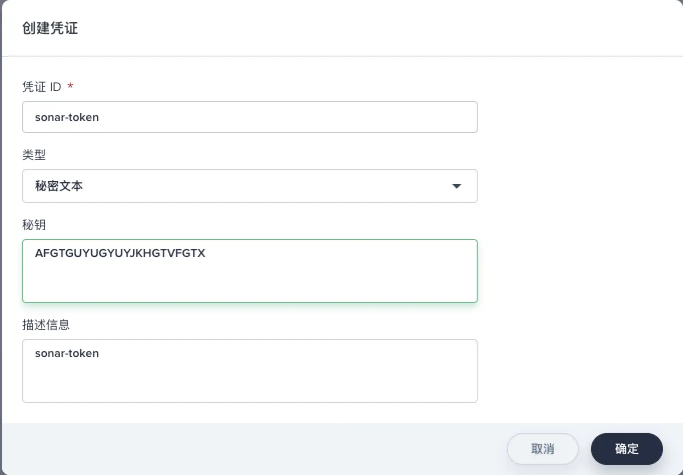 3、最后在 KubeSphere 中进入 devops-demo 的 DevOps 工程中,与上面步骤类似,在 凭证 下点击 创建,创建一个类型为 秘密文本 的凭证,凭证 ID 命名为 sonar-token,密钥为上一步复制的 token 信息,完成后点击 确定。