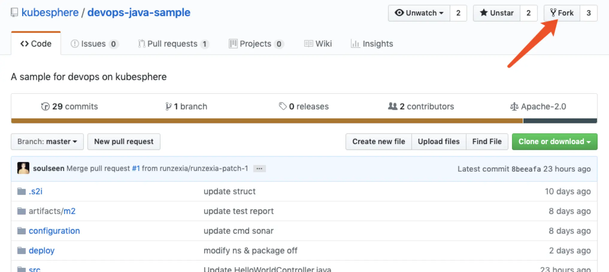登录 GitHub,将本示例用到的 GitHub 仓库 devops-java-sample Fork 至您个人的 GitHub。