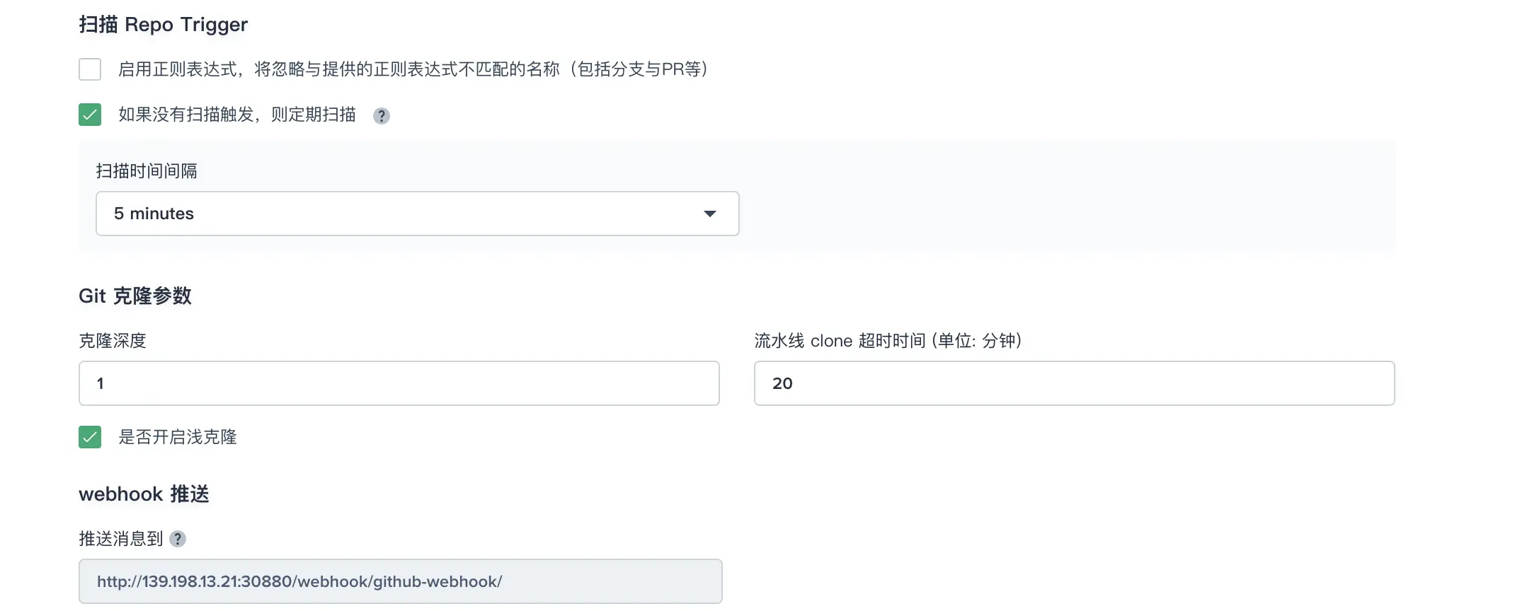 4、在 扫描 Repo Trigger 勾选 如果没有扫描触发,则定期扫描,扫描时间间隔可根据团队习惯设定,本示例设置为 5 minutes。