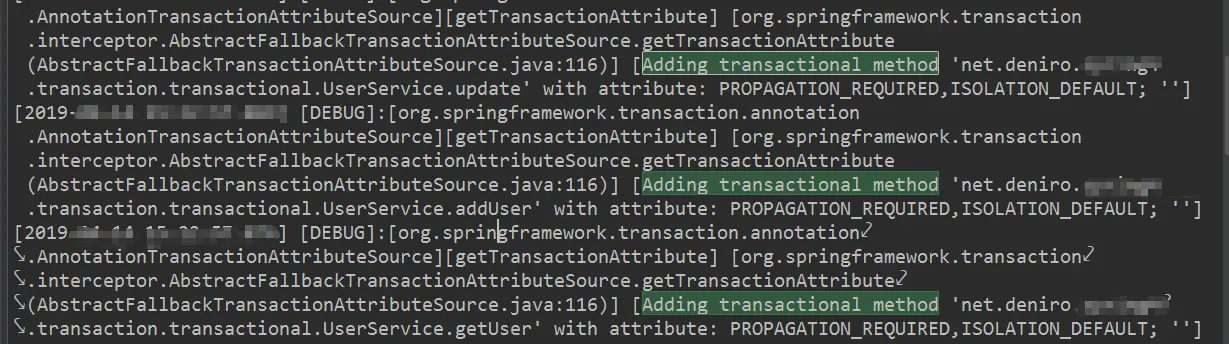从日志中可以看出,Spring 容器为这个类的所有方法,都织入了事务管理功能。