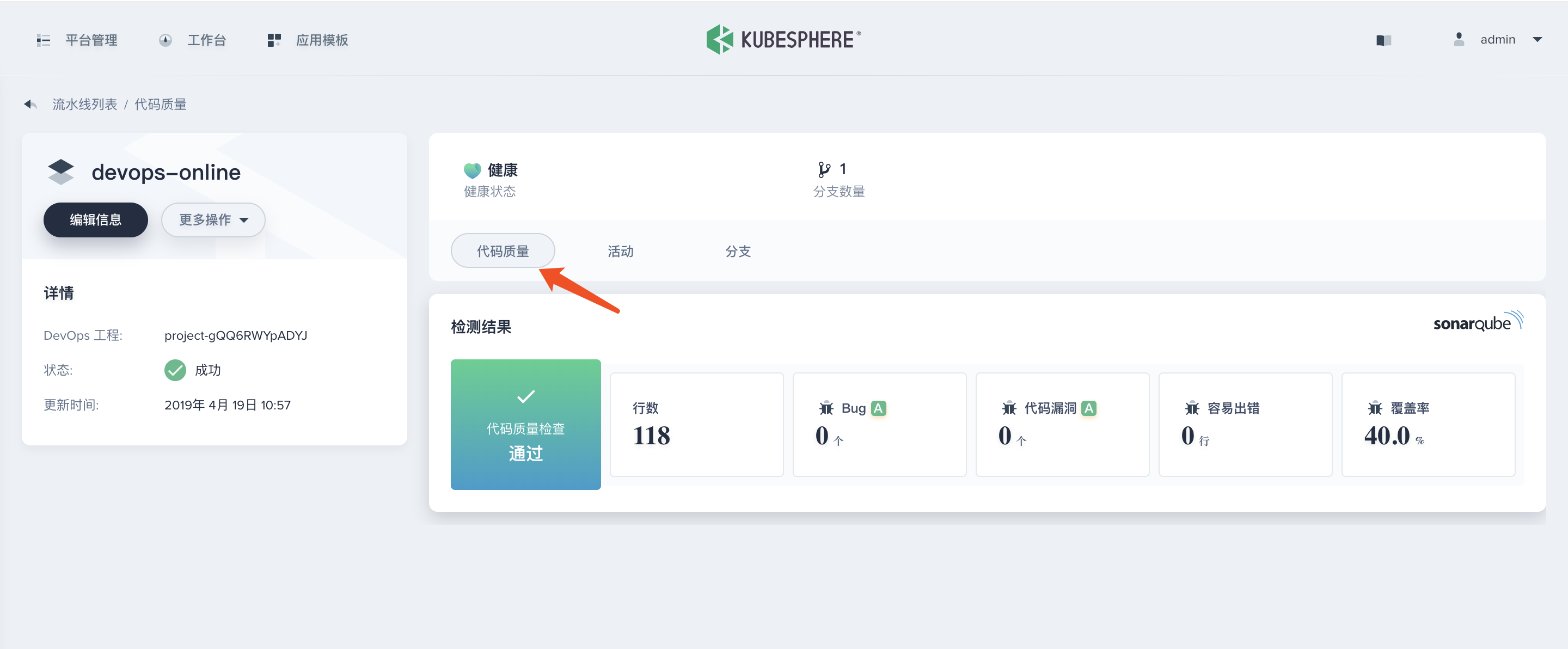 1、若流水线执行成功,点击该流水线下的 代码质量,即可看到通过 sonarQube 的代码质量检测结果,如下图(仅供参考)。