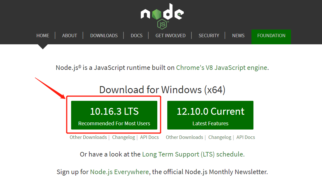 因为Hexo需要nodejs环境,因此需要先下载安装Nodejs。点击NodeJs官网,下载最新版本。