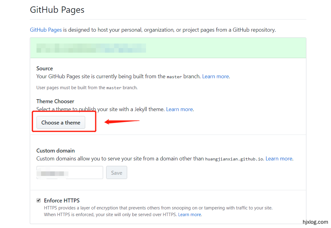 拉到下面,在GitHub Pages那里选择一个主题,确定之后即可通过域名来访问啦~比如我的https://huangjianxian.github.io