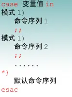 case 语句是在多个范围内匹配数据,若匹配成功则执行相关命令并结束整个条件测试;而如果数据不在所列出的范围内,则会去执行星号(*)中所定义的默认命令。语法结构如图: