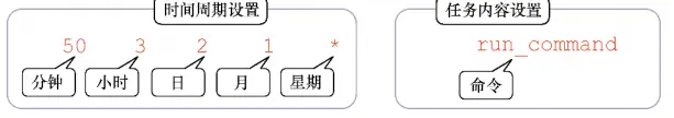 Linux 系统中一切都是文件,因此我们配置服务其实也是在修改服务的配置文件。当我们去使用 crond 服务时,其实也是在修改配置文件,文件默认是使用 Vim 编辑器打开。任务的配置有一套固定的格式;“分、时、日、月、星期 命令”,如果有些字段没有设置,则需要使用星号(*)占位,如图: