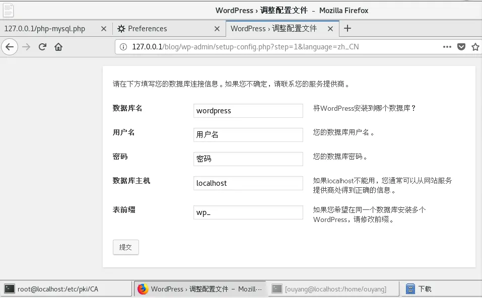 [root@localhost ~]# cp /var/www/html/blog/wp-config-sample.php /var/www/html/blog/wp-config.php ##重命名配置文件,原本的配置文件权限太小